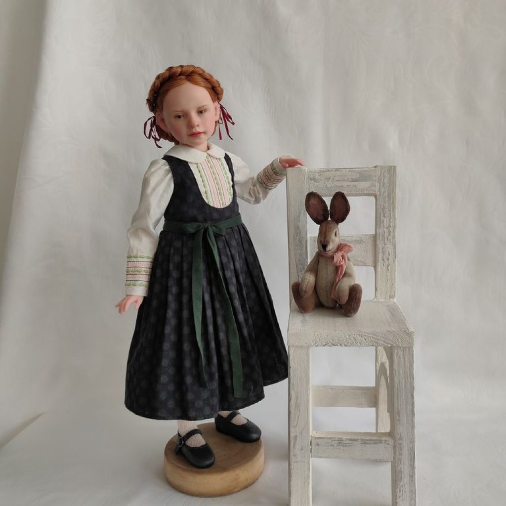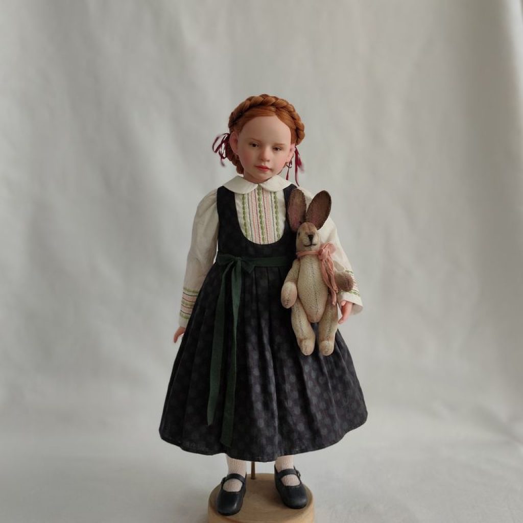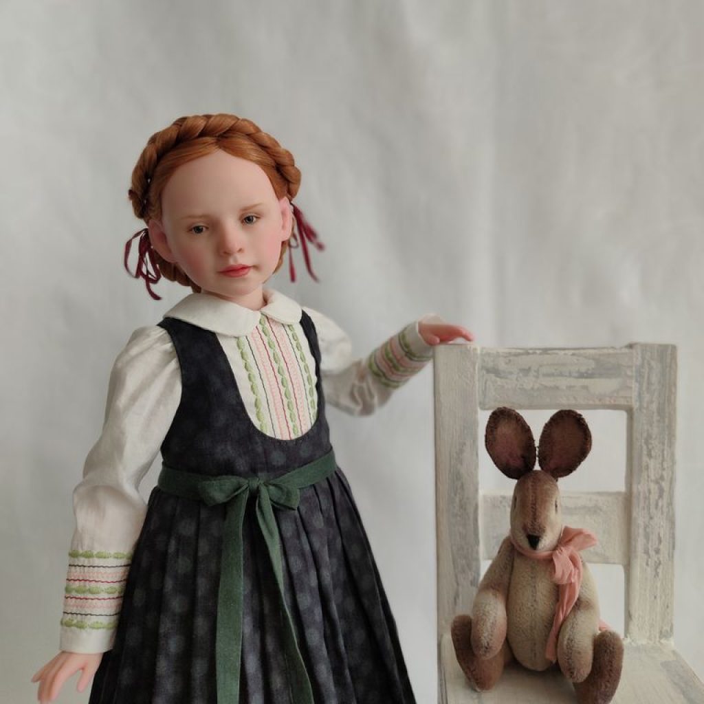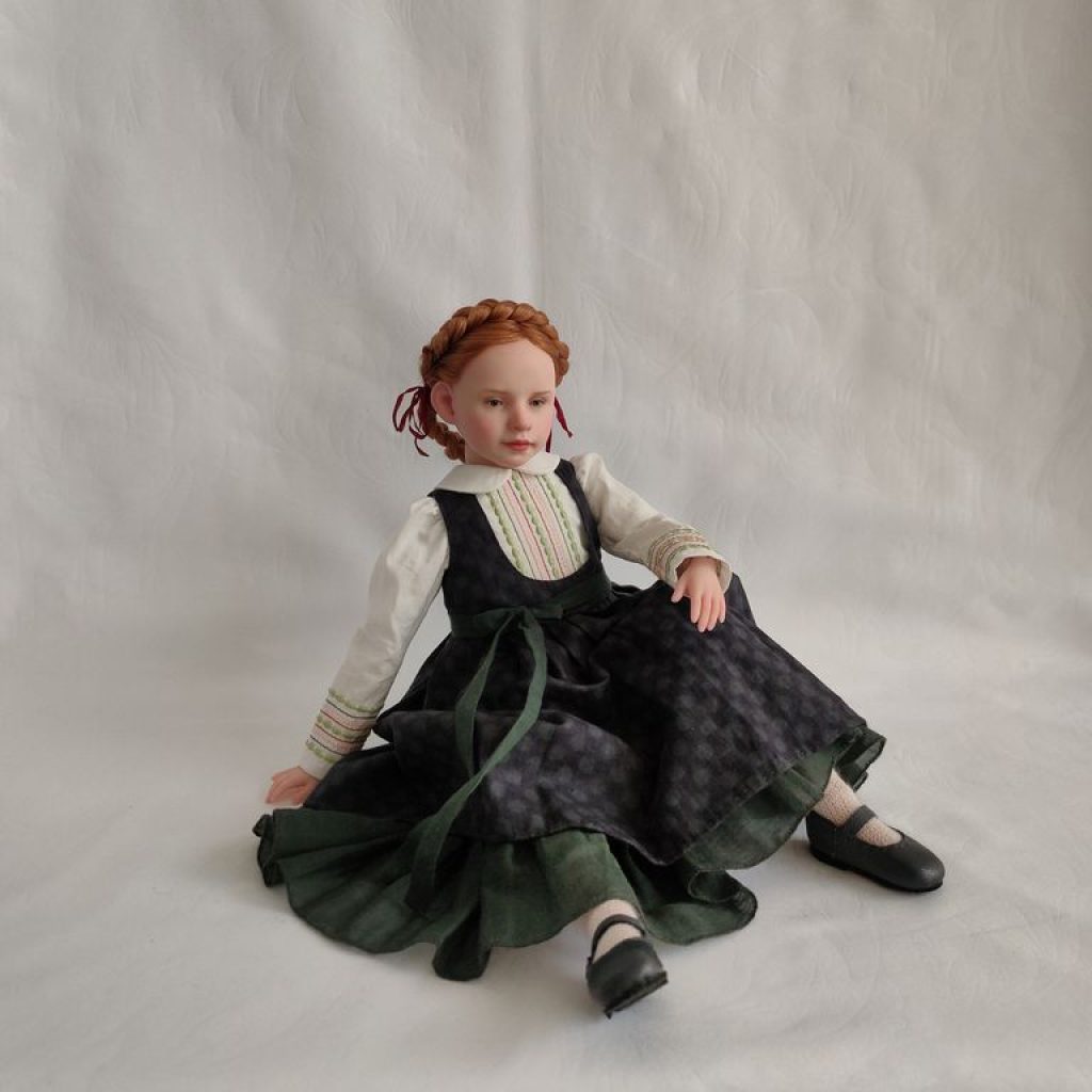 Девочка полушарнирная. Лепные части смесь 50/50 Living Doll и Cernit, тело мягконабивное на подвижном звеньевом каркасе. Соединение рук и ног на пружины. Роспись — масляные краски.
