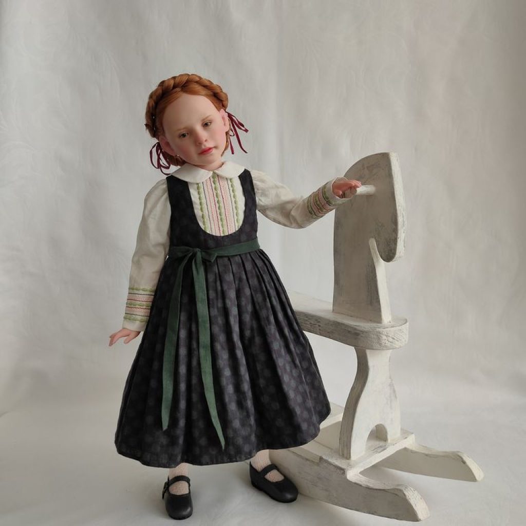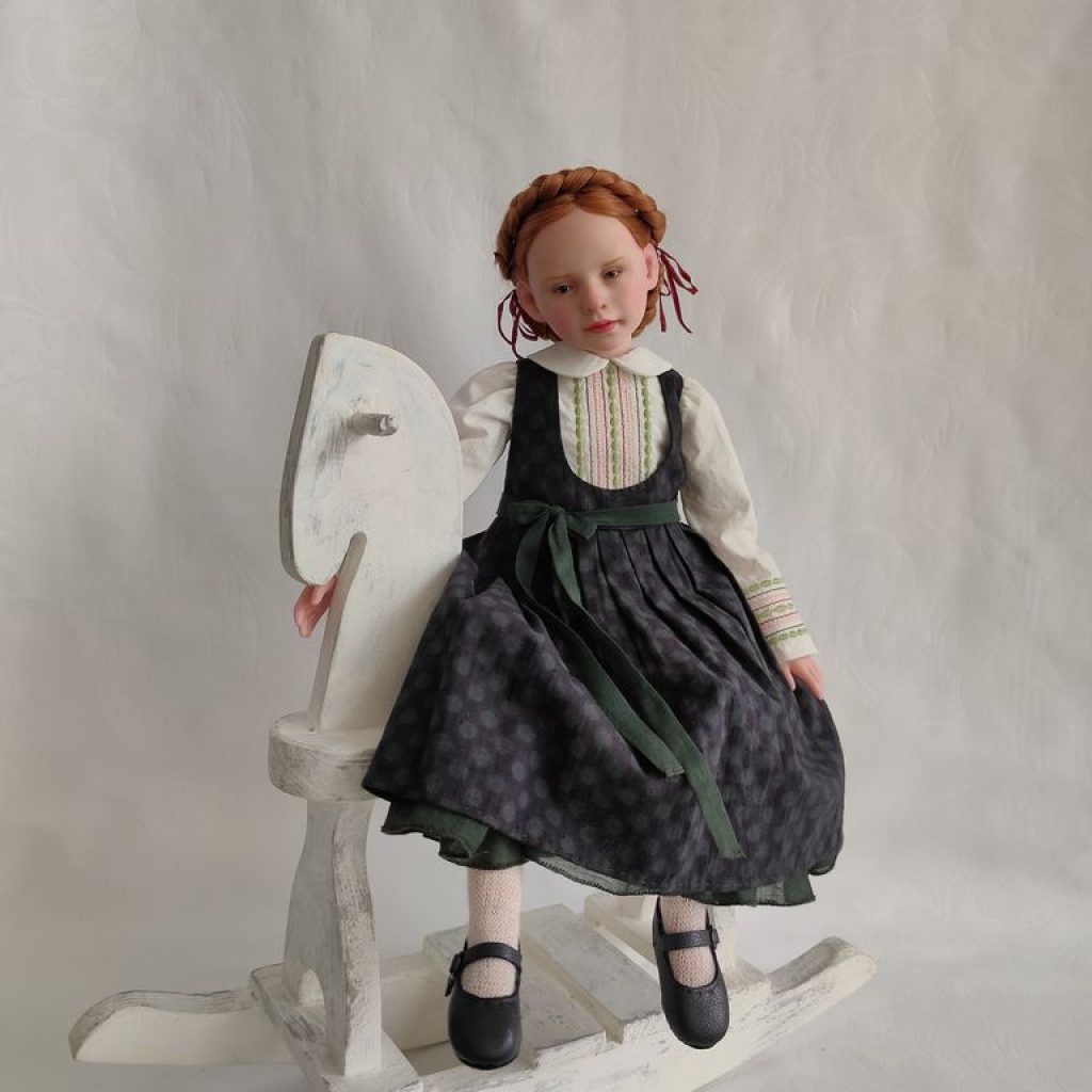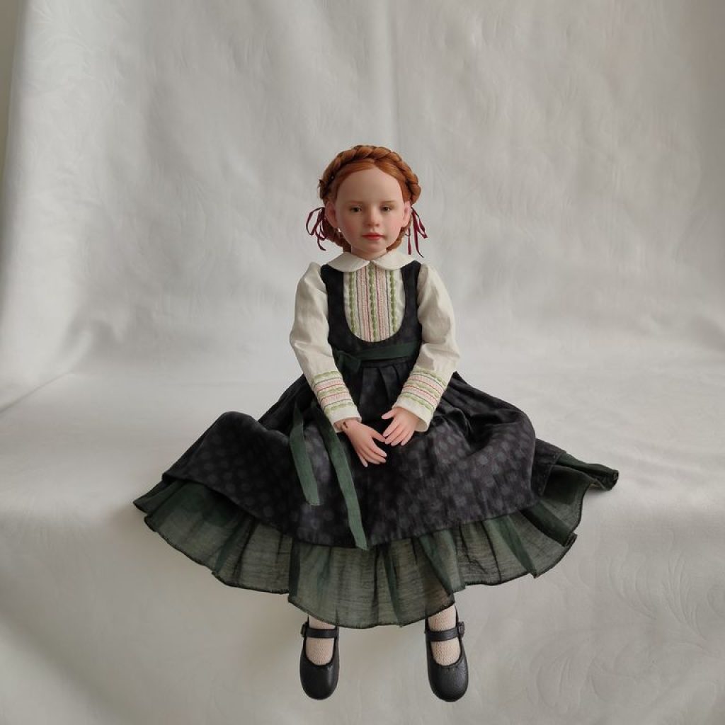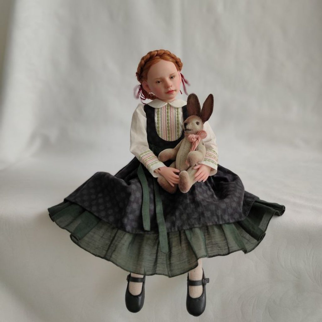 Девочка полушарнирная. Лепные части смесь 50/50 Living Doll и Cernit, тело мягконабивное на подвижном звеньевом каркасе. Соединение рук и ног на пружины. Роспись — масляные краски.